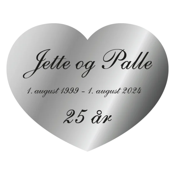 Et sølvbryllup er en af livets store begivenheder. Derfor skal rammerne være helt rigtige. Med dette hjerteformede bryllupsskilt sætter du straks stemningen, når gæsterne ankommer. Skiltet viser tydeligt parrets navne, som i dette eksempel ‘Jette og Palle’, samt datoerne for de 25 år. Det fungerer perfekt som et velkomstskilt bryllup, der byder venner og familie velkommen til fejringen. Samtidig løser det problemet med manglende personlig dekoration, som ofte kan gøre festlokaler upersonlige.