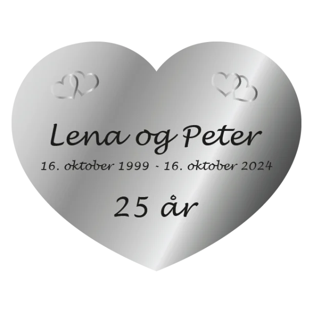 Gør jeres sølvbryllup endnu mere mindeværdigt med et Bryllupsskilt sølv hjerte der udstråler kærlighed, lykke og fejrer jeres 25 år sammen. Bestil i dag og giv jeres kærlighedsfejring den opmærksomhed og skønhed, den fortjener! Sørg for at besøge vores webshop og bliv ejeren af et personligt bryllupsskilt, der vil blive skattet i mange år frem.