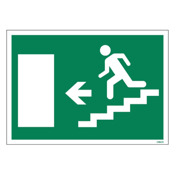 Vores “Exit ned af trappen til venstre” skilt er designet til at være intuitiv forståeligt for alle. Den velkendte symbolik kombineret med enkel tekst styrker forståelsen og sikrer, at hver besøgende eller medarbejder omgående kan genkende udgangsruten, også under stress.