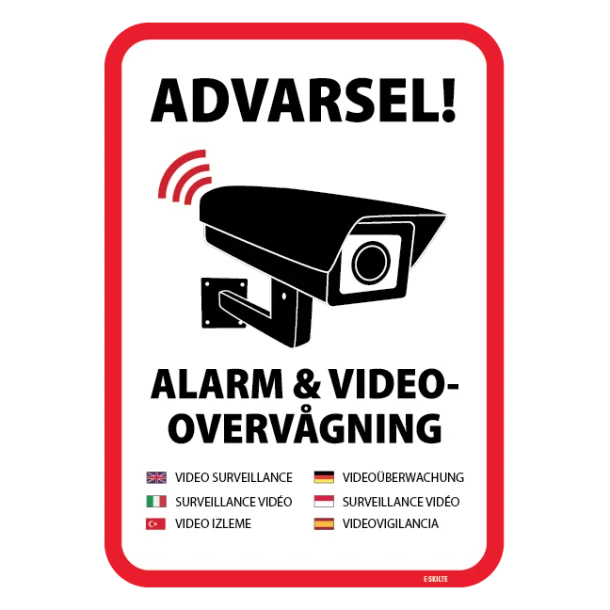 Driver du en virksomhed med mange forskellige nationaliteter? Dette advarsel videoovervågning skilt indeholder tekst på seks forskellige sprog: Dansk, Engelsk, Tysk, Fransk, Tyrkisk og Spansk. Det gør det ideelt til steder som hoteller, lufthavne eller store byggepladser.