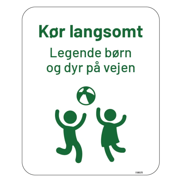 Gør dit nabolag eller område til et sikkert sted for børn og dyr med vores “Kør langsomt legende børn og dyr på vejen skilt” i iøjnefaldende grønt. Vores holdbare og tydeligt kommunikerende skilte er perfekte for residential områder, skoler, parker og alle steder, hvor der er en øget risiko for små fødder og poter på vejen.