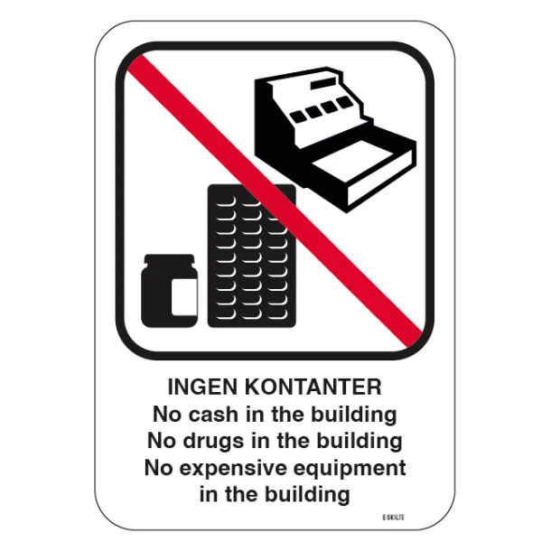 Det er vigtigt at kommunikere tydeligt og effektivt, når det gælder sikkerhed og regler i dine bygninger. Med vores “No cash in the building – No drugs in the building – No expensive equipment in the building” skilt, får du et kraftfuldt redskab til netop dette. Bestil dit skilt i dag og tag det næste skridt mod en sikrere og mere tryg omgivelse.