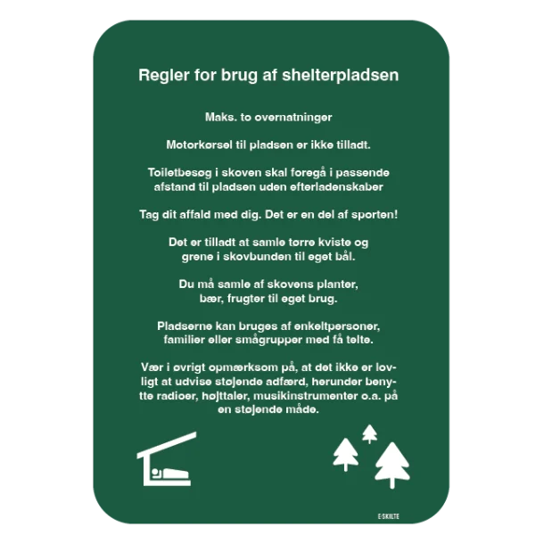 Bestil nu, og fremhæv værdierne af fællesskab og respekt på jeres udendørs areal med et Shelterplads Regler Skilt, der taler klart til alle besøgende.