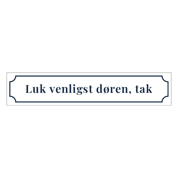 Vores “Luk venligst døren tak” skilt er designet med en tydelig skrifttype og en simpel layout, hvilket sikrer at beskeden kommunikeres høfligt og effektivt. Det klassiske design sikrer, at skiltet smelter sammen med dit lokale design, uanset om det er til privat eller erhvervsmæssig brug.