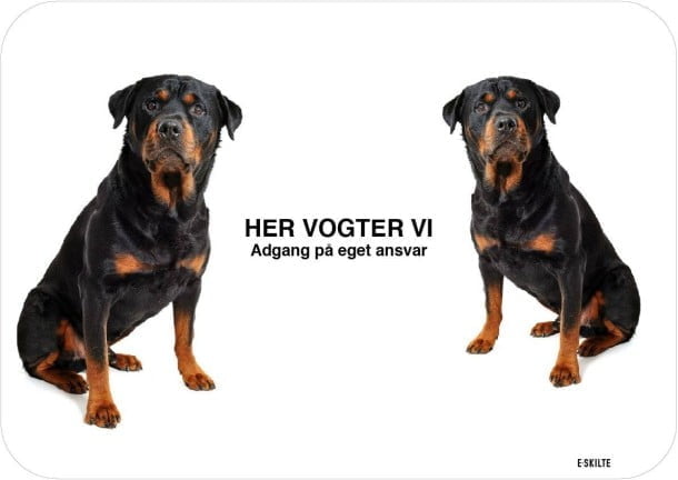 Vælg dette skilt for at kombinere funktionalitet med et stærkt visuelt udtryk. Sikkerhed har aldrig været mere kompromisløs og klart kommunikeret end med vores “Her vogter vi. Dobbelt rottweiler skilt”. Gør det tydeligt for alle, at du værner om dit privatliv og sikkerhed med et skilt der både advarer og beskytter.