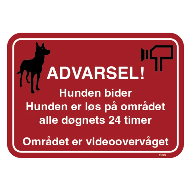 Tag ingen chancer når det kommer til sikkerheden på dit område. Med vores “Advarsel! Hunden bider – hunden er løs på området alle døgnets 24 timer – Området er videoovervåget”-skilt sender du et stærkt signal om, at området er beskyttet, og at der tages forholdsregler for at sikre det. Bestil dit skilt i dag og vær sikker på, at dit budskab bliver set og respekteret.