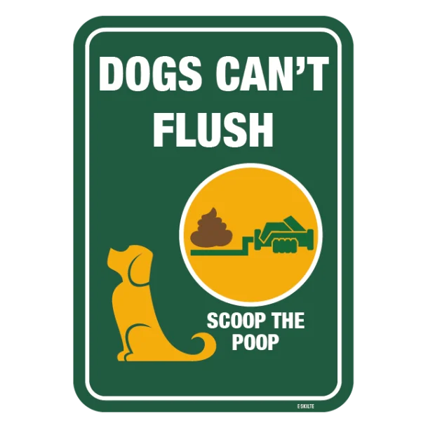 Ved at anvende et “Dogs can’t flush Scoop the poop” skilt, kombineres vigtigheden af renlighed med en lille dosis humor, der får budskabet til at stå ud. Dette sjove, men oplysende skilt tjener som en påmindelse for hundeejere om at agere ansvarligt, uden at virke for anklagende eller aggressiv.