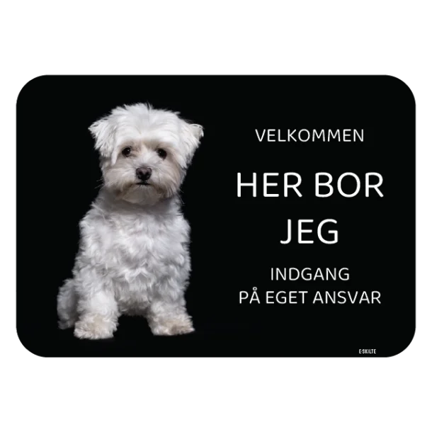 Møder dine besøgende en charmerende og venlig Malteser, så fortjener denne firbenede ven et “Her bor jeg skilt med Malteser”! Uanset om du bor i hus eller lejlighed, er dette skilt det perfekte tegn på, at her hersker en Malteser med sin søde og loyal persona. Skab et indbydende og varmt indtryk ved din indgang, samtidig med at du viser din kærlighed til din hund.