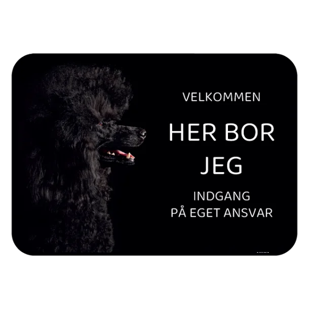 Ikke vent længere. Vis din stolthed og invitér verden indenfor hos dig og din pudel. Bestil dit “Her bor jeg skilt – hund Pudel sort” i dag og gør dit hjem til pudelens slot!