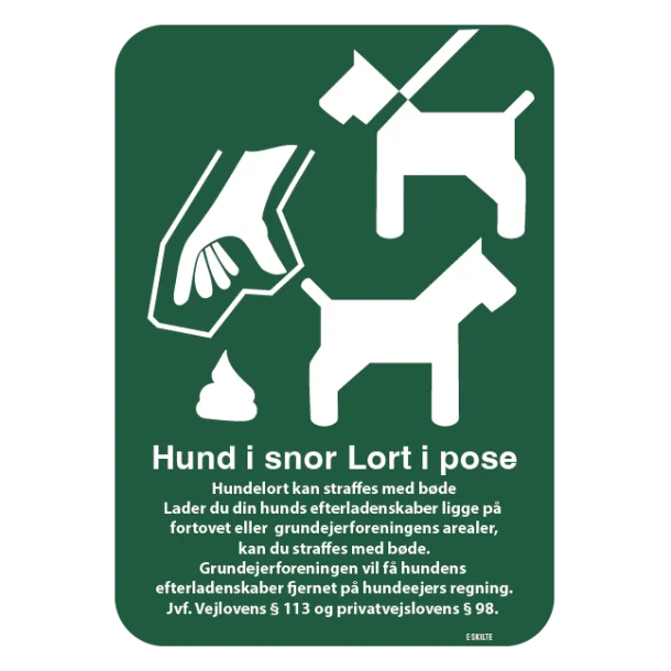 Ved at sætte skiltet op, bidrager du til et mere ansvarligt hundehold og skaber et trygt og behageligt miljø for alle. Det enkle, men effektive budskab hjælper med at minde hundeejerne om deres ansvar og bidrager til en positiv sameksistens mellem mennesker og dyr på dit private område.