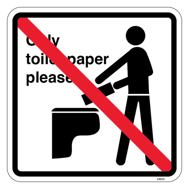 Uanset hvor dine toiletter befinder sig, er dette skilt en nødvendighed. Det universelt forståelige piktogram sætter et tydeligt visuelt kryds over alt andet affald end toiletpapir, hvilket leder brugerens opmærksomhed hen på det eneste, der hører hjemme i toilettet.