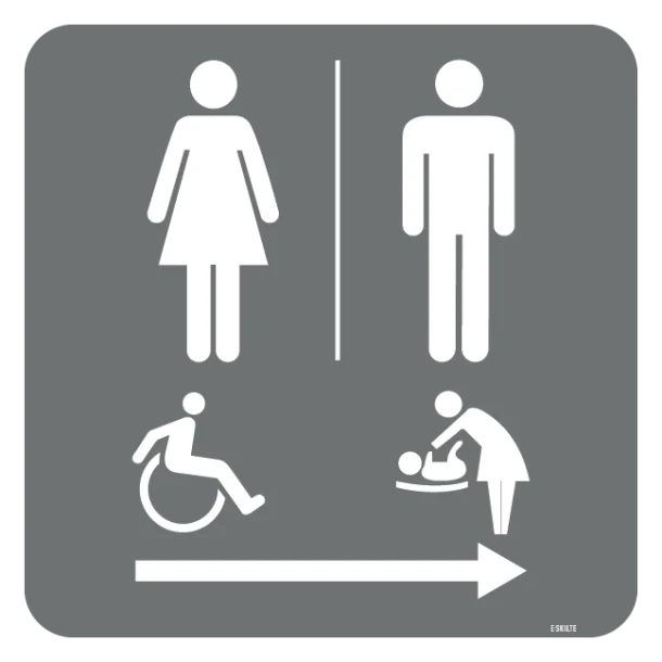 Universelt design: Med dets rene linjer og simple ikonografi formidler dette skilt en klar instruktion: hvilken retning toilettet befinder sig i. Dette gør navigationen nem og stressfri for besøgende eller kunder, hvilket skaber en mere tilgængelig og indbydende atmosfære.
