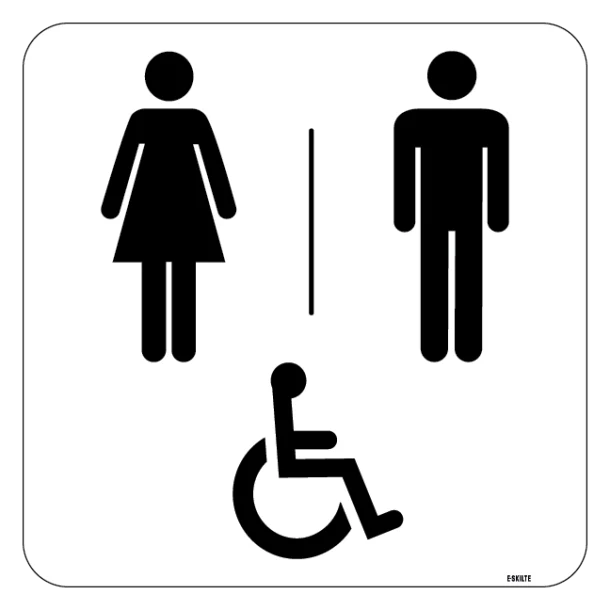 Med et universelt Dame, Herre og Handicap toilet skilt viser du tydeligt din forpligtelse til inklusivitet og lettilgængelige faciliteter for alle. Skiltet betyder, at du respekterer og værdsætter forskellene i dine kunders eller gæsters behov og gør en indsats for at imødekomme dem alle.