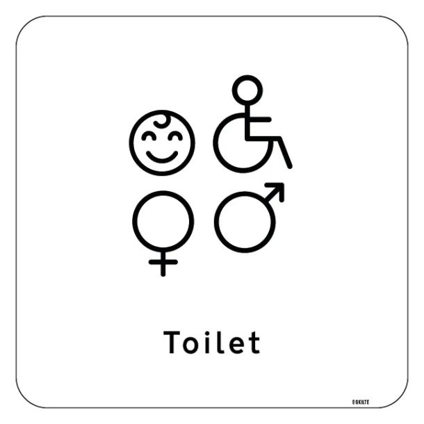Med et enestående design, der kombinerer alle nødvendige symboler på ét skilt, kommunikerer du klart og tydeligt, hvor gæsterne finder toiletfaciliteter, der passer til alle behov. Skiltets alsidige anvendelse gør det til en perfekt løsning uanset stedets størrelse eller brugerens specifikke behov.