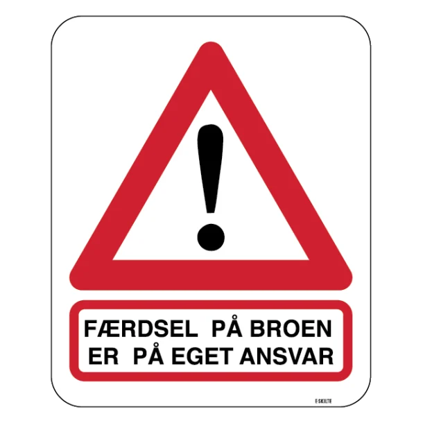 Uanset om du skal bruge skiltet til private broer, virksomhedens ejendomme eller offentlige områder, så leverer vi et produkt, der står for sikkerhed og klarhed. Ansvarsfraskrivelsen bliver tydeligt markeret for alle brugere af broen, hvilket kan være afgørende i tilfælde af hændelser.