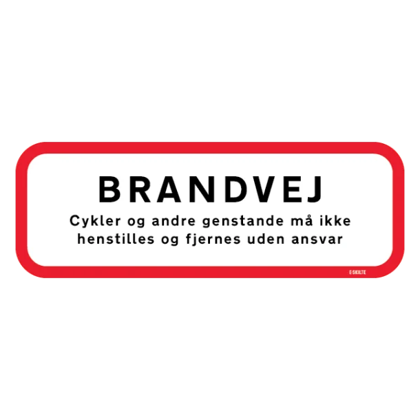 Med et tydeligt og letlæseligt design sikrer dette skilt, at alle omkring din ejendom forstår vigtigheden af at holde brandvejen åben. Det er et visuelt kraftfuldt værktøj, der kommunikerer, at der ikke må henstilles cykler eller andre genstande, og at overtrædere risikerer at få deres ejendele fjernet uden ansvar for ejeren af skiltet.