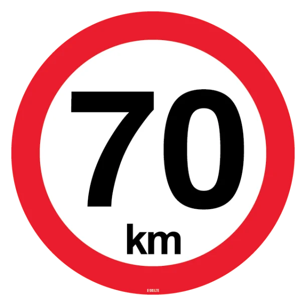 Dette hastighedsbegrænsningsskilt er designet til at formidle et klart og tydeligt budskab til bilister: Overhold fartgrænsen på 70 km/t. Det kan anvendes på en lang række steder, såsom ved indgange til boligområder, skoleområder, byzoner eller andre steder, hvor det er vigtigt at kontrollere hastigheden. Et skilt som dette er et uundværligt værktøj i trafiksikkerhedsarbejdet og bidrager til at nedbringe risikoen for ulykker.