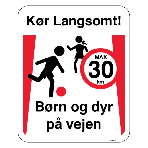 Kør langsomt Børn og dyr på vejen max 30 km skilt