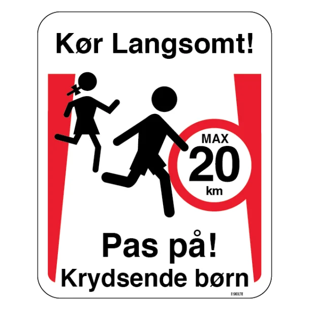 Dette skilt er ideelt til brug i boligområder, nær skoler, legepladser og andre steder, hvor børns sikkerhed er af høj prioritet. Skiltets tydelige budskab og illustrative grafik gør det klart for alle bilister, at de bør køre med ekstra omhu og opmærksomhed for at beskytte de yngste og mest sårbar deltagere i trafikken.