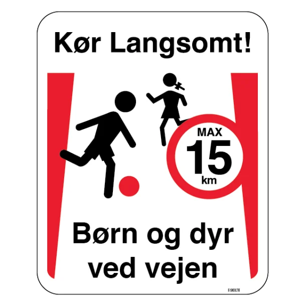 - Øget sikkerhed – Markerer vigtigheden af nedsat fart omkring legende børn og dyr.