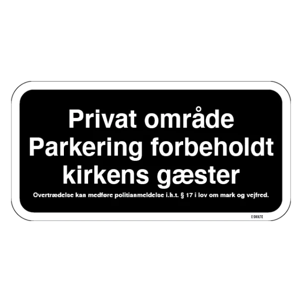 Dette skilt er ikke kun praktisk, det kommunikerer også tydeligt dine parkeringsrestriktioner. Med teksten “Overtrædelse kan medføre politianmeldelse i.h.t. § 17 i lov om mark og vejfred” bliver det klart for enhver, at dette er en zone udelukket for kirkens gæster og at der håndhæves sanktioner ved overtrædelser. Dette vil resultere i færre parkeringskonflikter og en mere harmonisk oplevelse for alle.