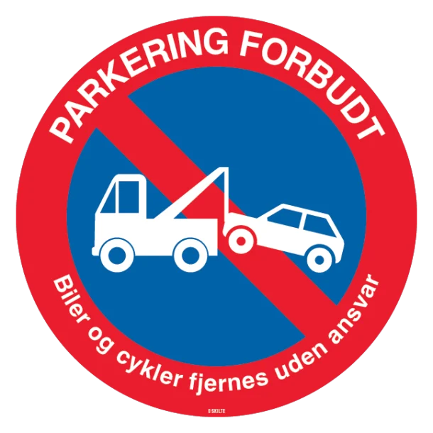 Dette skilt hjælper med at skabe et sikkert og kontrollerbart parkeringsområde, og sikrer at reglerne bliver overholdt. Det tydelige budskab om, at biler og cykler vil blive fjernet uden ansvar, virker preventivt og minimerer problemer med ulovlig parkering.