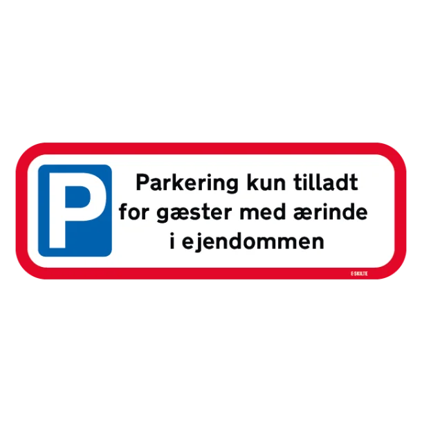 Med et ‘Parkering kun tilladt for gæster med ærinde’ skilt fra vores webshop, får du ikke kun et produkt, der tydeliggør parkeringsreglerne, men også et robust og vejrbestandigt skilt, der står klart i al slags vejr og holder til det danske klima. Plus, med en række forskellige materialer at vælge imellem, kan du tilpasse skiltets udseende og funktionalitet præcis til dine behov.