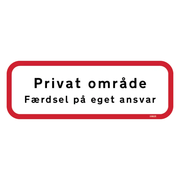 Uanset hvor dit private område er lokaliseret, så passer vores skilt ind i omgivelserne. Skiltet er designet til at være synligt og læsbart under alle forhold. Dets formål er at informere og advare gæster og forbipasserende om, at de bevæger sig på et område, hvor de skal være ekstra opmærksomme og tage hensyn.