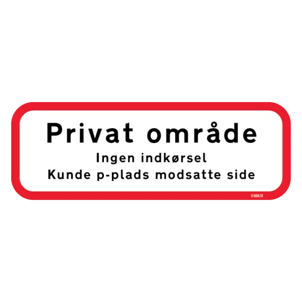 Vores skilte er designet med et fokus på enkelthed og forståelighed. Med få sekunders observation er beskeden klar: Dette er et privat område, og kundeparkeringen findes andetsteds. Den intuitive ikonografi og tekst gør dette skilt til en umiddelbar informationskilde for alle besøgende.