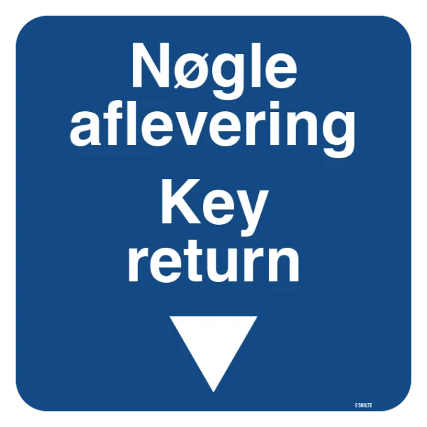 Vores ‘nøgle aflevering skilt’ er udviklet med et klart og tydeligt budskab, der straks fanger opmærksomheden og instruerer brugerne om, hvor og hvordan nøgler skal afleveres. Skiltet anvender universelt forståelige symboler og tekst for at maksimere forståelsen og effektiviteten.