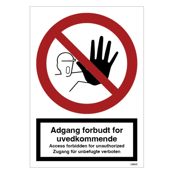 Vores flersprogede “Adgang forbudt” skilt er det oplagte valg, når dit mål er klar kommunikation på tværs af sproglige barriere. Sikr dig i dag, at din ejendom eller arbejdsplads kommunikerer klart og tydeligt til et globalt publikum med et skilt, der siger det hele, uanset hvilket sprog dine gæster taler.