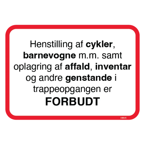 Er du træt af rod og uorden i din ejendoms trappeopgang? Vores “Henstilling af cykler barnevogne m.m. samt oplagring af affald, inventar og andre genstande i trappeopgangen er forbudt” -skilt er den perfekte løsning for at opretholde en ryddelig og sikker adgangsvej. Med et klart og letforståeligt budskab sikrer dette skilt, at beboere og gæster forstår betydningen af at holde fællesområder frie og tilgængelige.