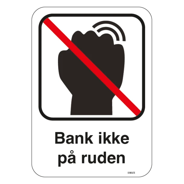 Vil du undgå uønsket banken og støj ved dine ruder? Vores “Bank ikke på ruden” skilt giver en klar besked til besøgende eller forbipasserende, så du kan skabe et mere fredeligt og respektfuldt miljø. Dette skilt er perfekt til ethvert sted, hvor ro er essentielt, hvilket gør det ideelt til bl.a. kontorer, klinikker, private hjem eller ethvert område, hvor koncentration og ro er en prioritet. Skiltets klare budskab kommunikerer effektivt dit ønske uden at du selv skal gøre en indsats.