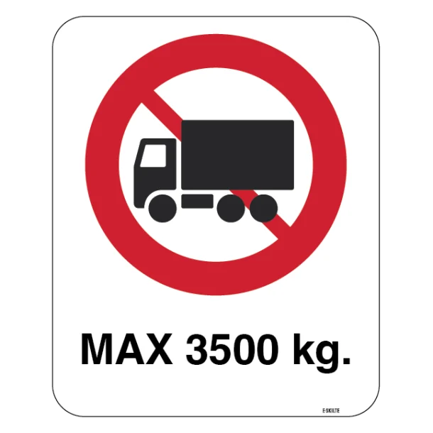 Med vores Lastbil forbud max 3500 kg skilt, får du et klart og tydeligt budskab ud til erhvervschauffører og andre trafikanter. Skiltet er designet til at informere om, at vejen foran dem er lukket for køretøjer, der vejer over 3500 kg. Dette bidrager til øget sikkerhed og ordnede forhold på veje, der ikke er egnet til tung trafik.