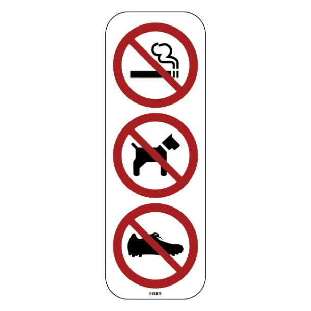 Vil du sende et klart og utvetydigt signal om, at visse aktiviteter ikke er tilladte i dit område? Vores Forbuds skilte højkant rygning hund Fodboldstøvle skilt er den perfekte løsning til at kommunikere dine budskaber. Skiltet har en enkel, men iøjnefaldende design, der kombinerer forbudsmærker for rygning, hunde og brugen af fodboldstøvler – ideel til brug på steder, hvor renlighed og sikkerhed er af højeste prioritet.