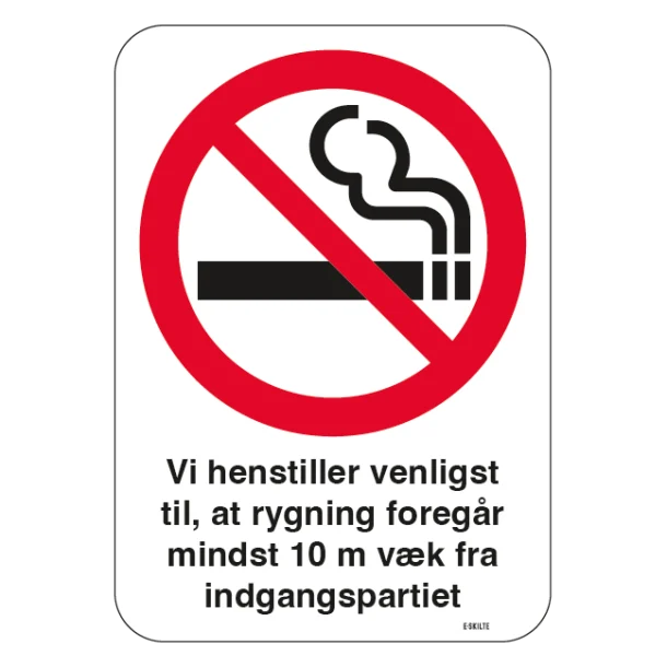 Med installationen af et “Vi henstiller til rygning foregår mindst 10 m væk”-skilt ved dit indgangsparti, investerer du ikke kun i et røgfrit miljø men også i dit firmas professionalisme og omsorg for medarbejderes og besøgendes velvære.