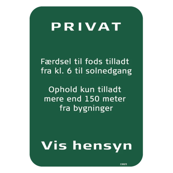 Sæt et klart og tydeligt præg på dit naturområde. Vælg det “Privat 9, Færdsel til fods tilladt fra kl 6 til solnedgang skilt” til din ejendom og bidrag til ansvarlig færdsel i Danmarks skønne natur.