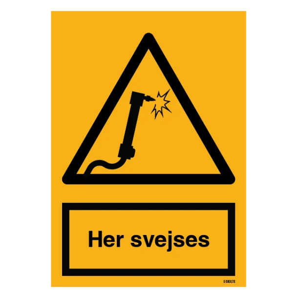 Et “Her svejses skilt” er et universelt symbol på at der udføres arbejde, der involverer svejsning, hvilket kan medføre lysglimt og flyvende gnister. Skiltet formidler omgående nødvendigheden af at bære passende beskyttelsesudstyr og opfordrer til forsigtighed.