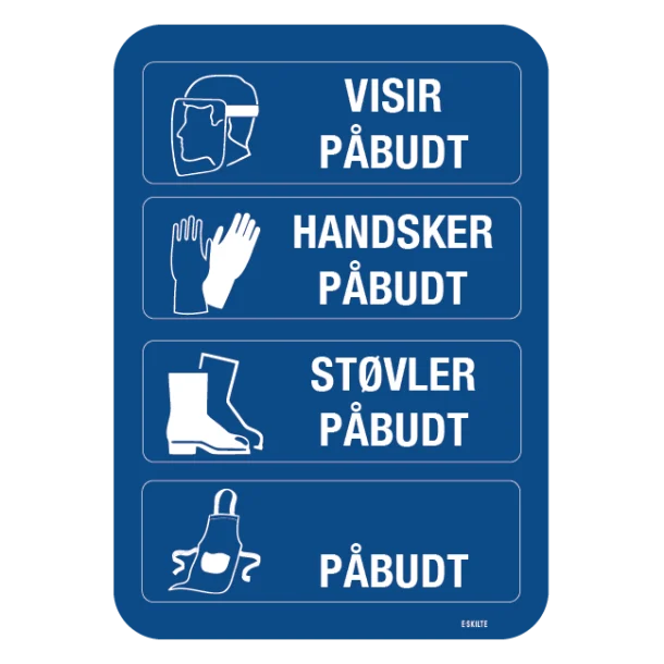 Vær ikke i tvivl om sikkerheden og klarheden på dit arbejdssted. Gør det rigtige valg for dine medarbejderes og virksomhedens sikkerhed ved at investere i vores “Visir påbudt Handsker påbudt Støvler påbudt Forklæde påbudt – Værnemiddelskilt” allerede i dag. Skiltets klare kommunikation af sikkerhedsforanstaltninger er uvurderlig, og dets holdbarhed sikrer, at dit arbejdsmiljø forbliver sikkert for alle, der færdes der.