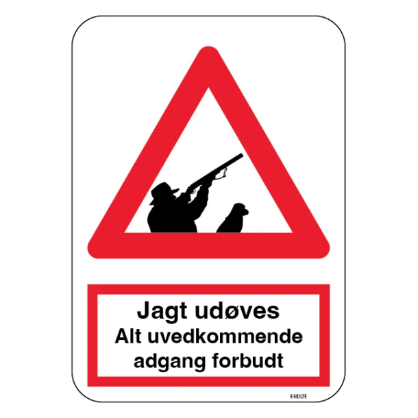 Dette robuste og opsigtsvækkende skilt formidler et klart budskab om, at jagt er i gang, og at adgang er forbudt for uvedkommende. Det fungerer som en effektiv advarsel til vandrere, naturelskere og andre personer, som kunne finde på at betræde området, hvilket sikrer både deres og jægernes sikkerhed.