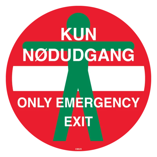 Sørg for sikkerhed og tydelig vejledning med “Kun Nødudgang – Only Emergency exit” skilt