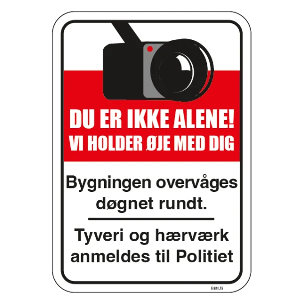 Du er ikke alene vi holder øje med dig Bygningen overvåges døgnet rundt Tyveri og hærværk anmeldes til politiet skilt