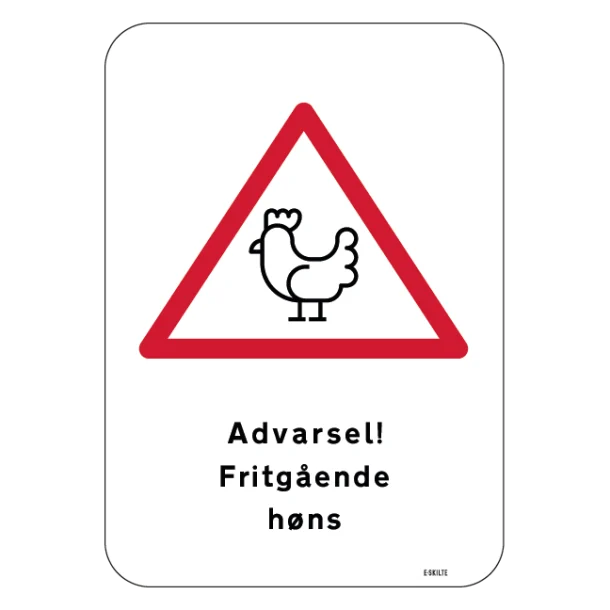 Skab en hyggelig og ansvarlig atmosfære på din ejendom med vores “Advarsel! Fritgående høns” skilt. Det er enkle, effektive og essentielle for enhver hønseejer. Bestil dit skilt i dag og bidrag til et sikrere miljø for både dine høns og dine gæster!