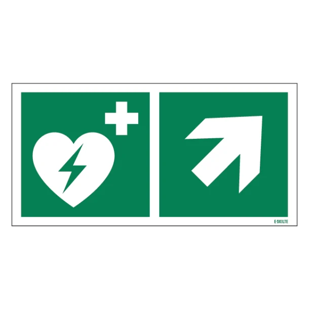 Dette nødskilt tager udgangspunkt i ISO 7010 piktogrammet “E010 Automated external heart defibrillator” fra ISO kategorien: E – Flugtvejsskilte / Henvisningsskilte.