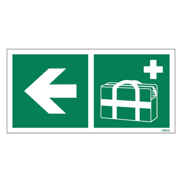Med sit iøjnefaldende design, er dette skilt den ideelle løsning for at sikre, at nødhjælp kan leveres hurtigt og effektivt. Piktogrammets klare budskab og retningstegn til venstre hjælper med at dirigere personer mod den uundværlige medicintaske, som kan rumme alt lige fra hjertestartere til førstehjælpskit.