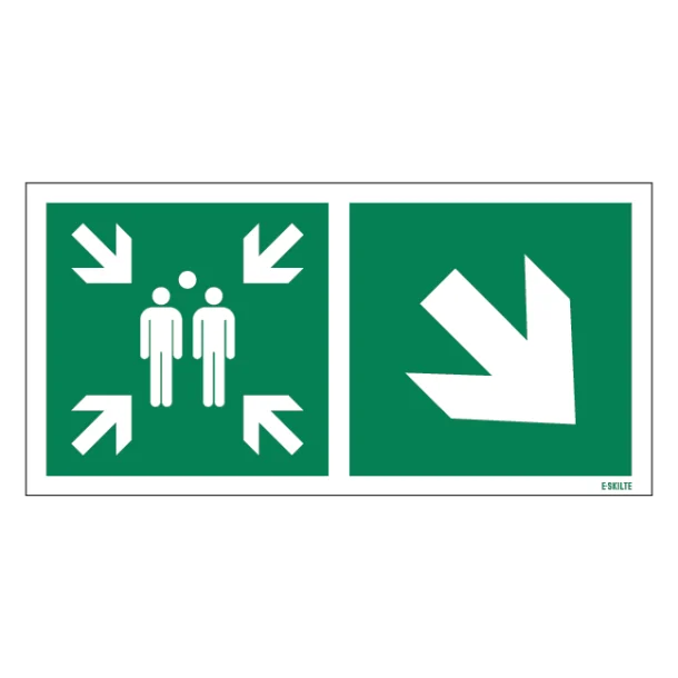 Med udgangspunkt i det internationalt anerkendte ISO 7010 piktogram “E005 Evacuation assembly point”, kommunikerer vores skilt klart, hvor personer skal gå hen for at finde samlingspunktet. Det letforståelige symbol sikrer, at både besøgende og medarbejdere på tværs af sprogbarrierer kan reagere korrekt og hurtigt i krisesituationer.