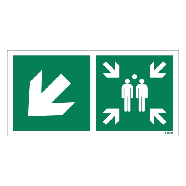 Dette nødskilt tager udgangspunkt i ISO 7010 piktogrammet “E005 Evacuation assembly point” fra ISO kategorien: E – Flugtvejsskilte / Henvisningsskilte.