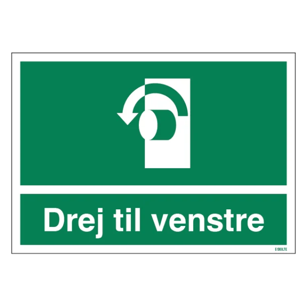 Dette nødskilt tager udgangspunkt i ISO 7010 piktogrammet “E018 Turn anticlockwise to open” fra ISO kategorien: E – Flugtvejsskilte / Henvisningsskilte.