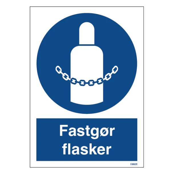 Med sit klare ISO 7010 piktogram “M046 Secure gas cylinders” fra kategorien: M – Påbudsskilte, kommunikerer dette skilt umisforståeligt og på tværs af sprogbarrierer. Den intuitive symbolik sikrer, at beskeden om at fastgøre gasflasker når ud til alle, der færdes i området.
