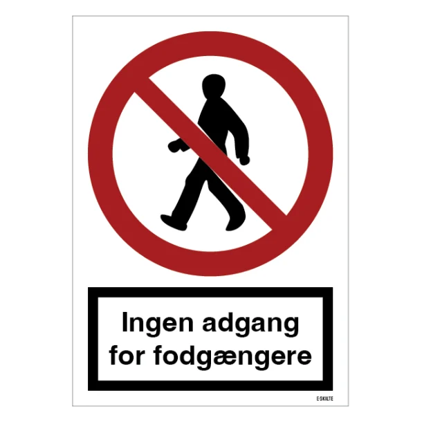 Gør det klart for alle, at adgangen er begrænset med vores tydelige Ingen adgang for fodgængere skilt. Med udgangspunkt i det anerkendte ISO 7010 piktogram “P004 No thoroughfare” sikrer dette forbudsskilt, at budskabet om ingen adgang for fodgængere forstås hurtigt og let af besøgende og ansatte. Det er en uundværlig del af din sikkerhedsskilteplan, som effektivt indikerer, hvor fodgængere ikke må færdes.